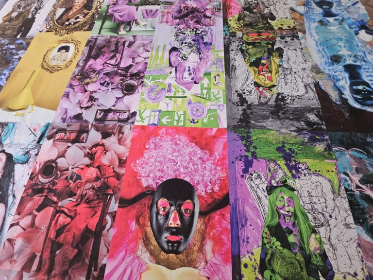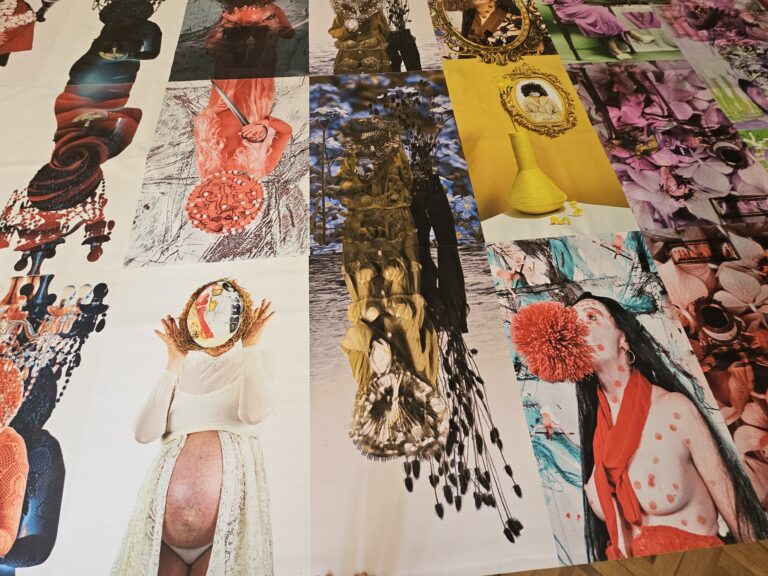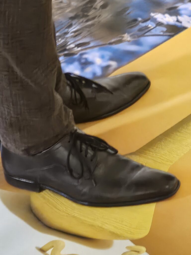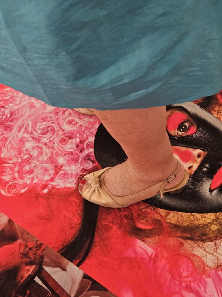 By stepping on the images — faces, bodies, eyes or the belly of a pregnant figure — the relationship between viewer and image changes. The images are no longer distant objects but surfaces of physical encounter.