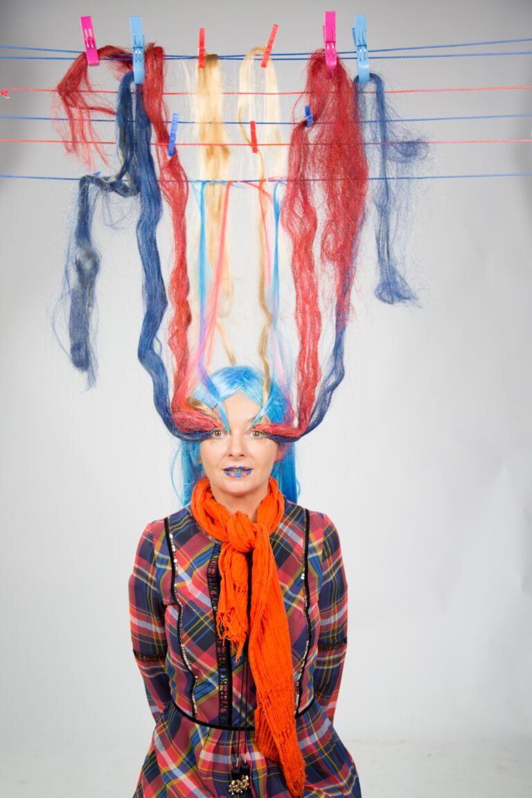 In the photographic series Rituals of Hair, hair becomes both material and language. Wigs, strands, and artificial extensions extend beyond the body and are suspended on ordinary laundry lines. What appears as a domestic gesture gradually reveals itself as a symbolic choreography. Clothespins and hanging strands create fragile structures that resemble both household tools and ceremonial devices.
