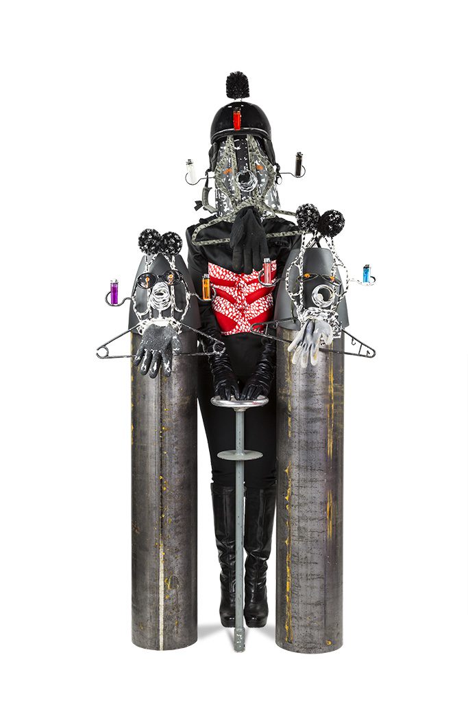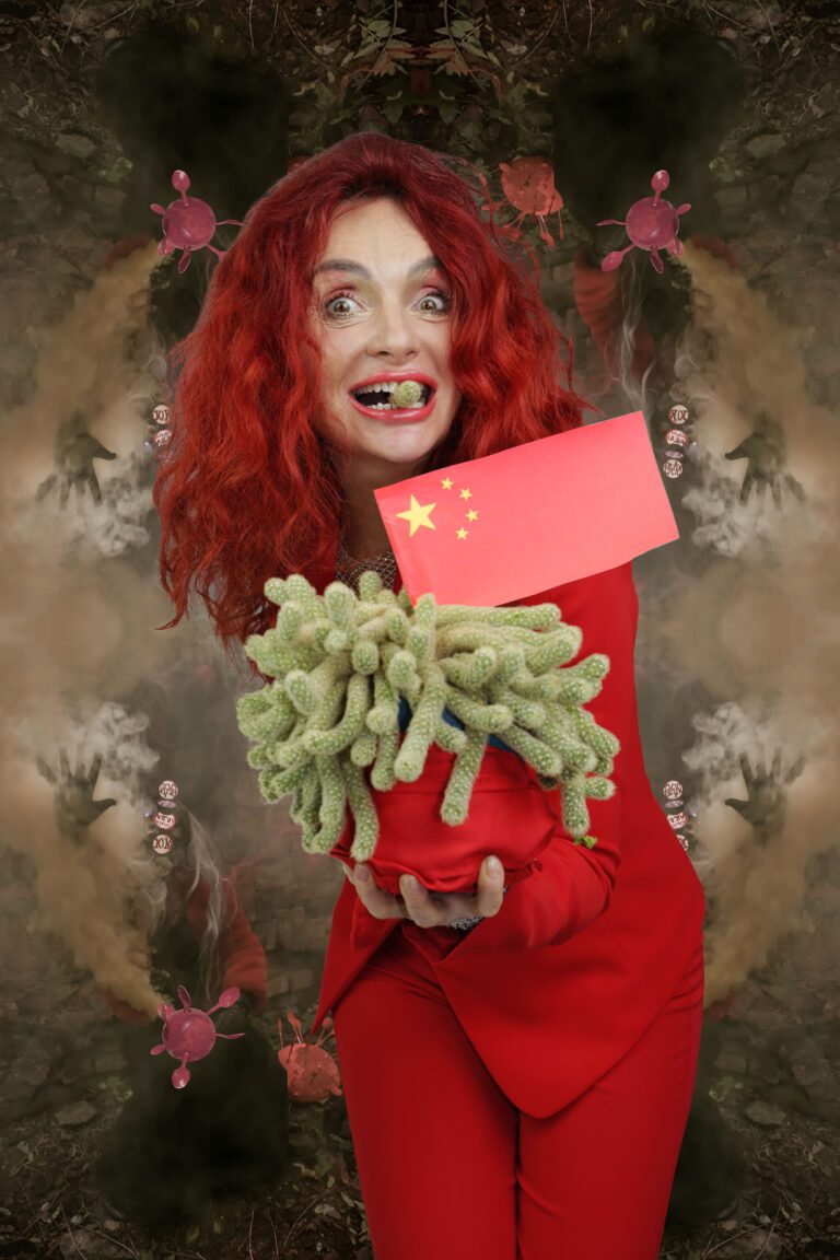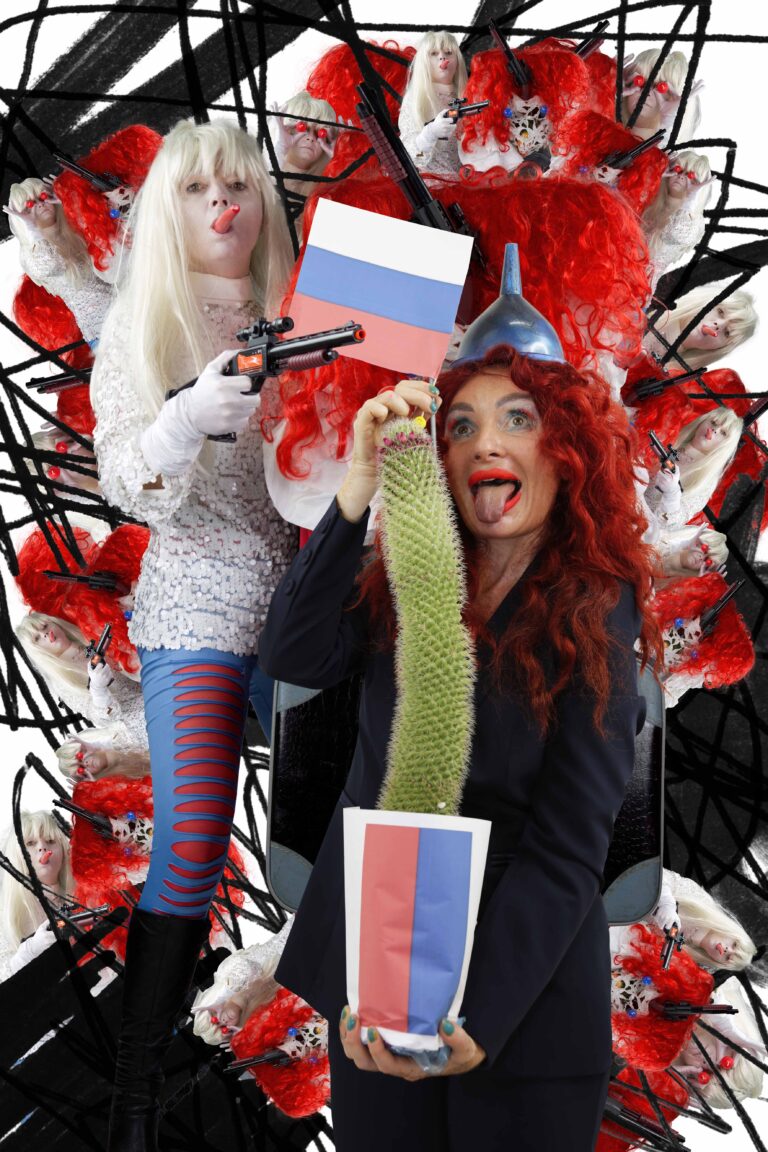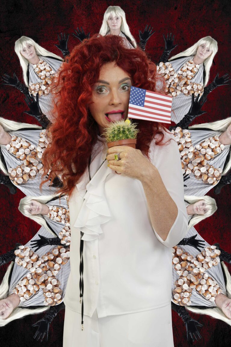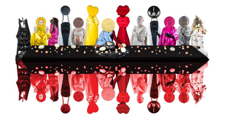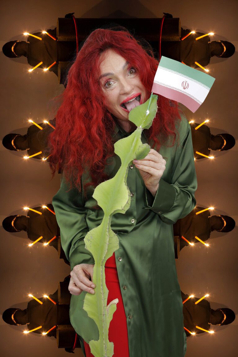 Flags, ritual gestures and theatrical props appear alongside everyday objects, creating images that oscillate between satire and contemporary iconography. By exaggerating these visual codes, the works reveal how power is staged, performed and maintained through collective rituals.